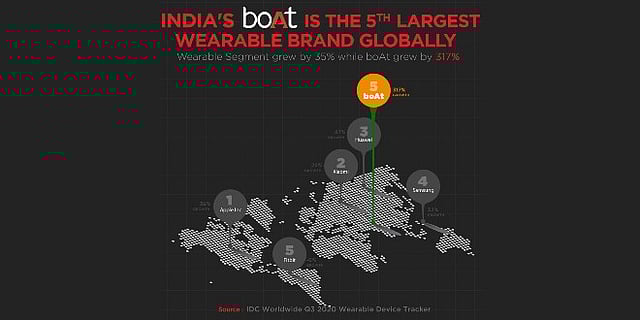 Breaking all barriers, home-grown consumer audio & accessories brand boAt Lifestyle has placed India on the global map by becoming 5th largest wearable brand basis shipments as per the leading market research and advisory firm International Data Corporation's (IDC) Worldwide Quarterly Wearable Device Tracker for 3Q20 (July-September 2020). In addition to becoming the 5th largest wearable brand, boAt has also solidified its position in the Indian market by capturing 1/3rd market share. According to IDC data, the brand sailed through the pandemic to break all records and has witnessed a growth of 4X to reach 3.3 million units shipped in the last quarter.