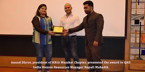 Anand Dhruv, president of HRIA Mumbai Chapter, presented the award to QAD India Human Resources Manager RupaliMahadik during an award ceremony.